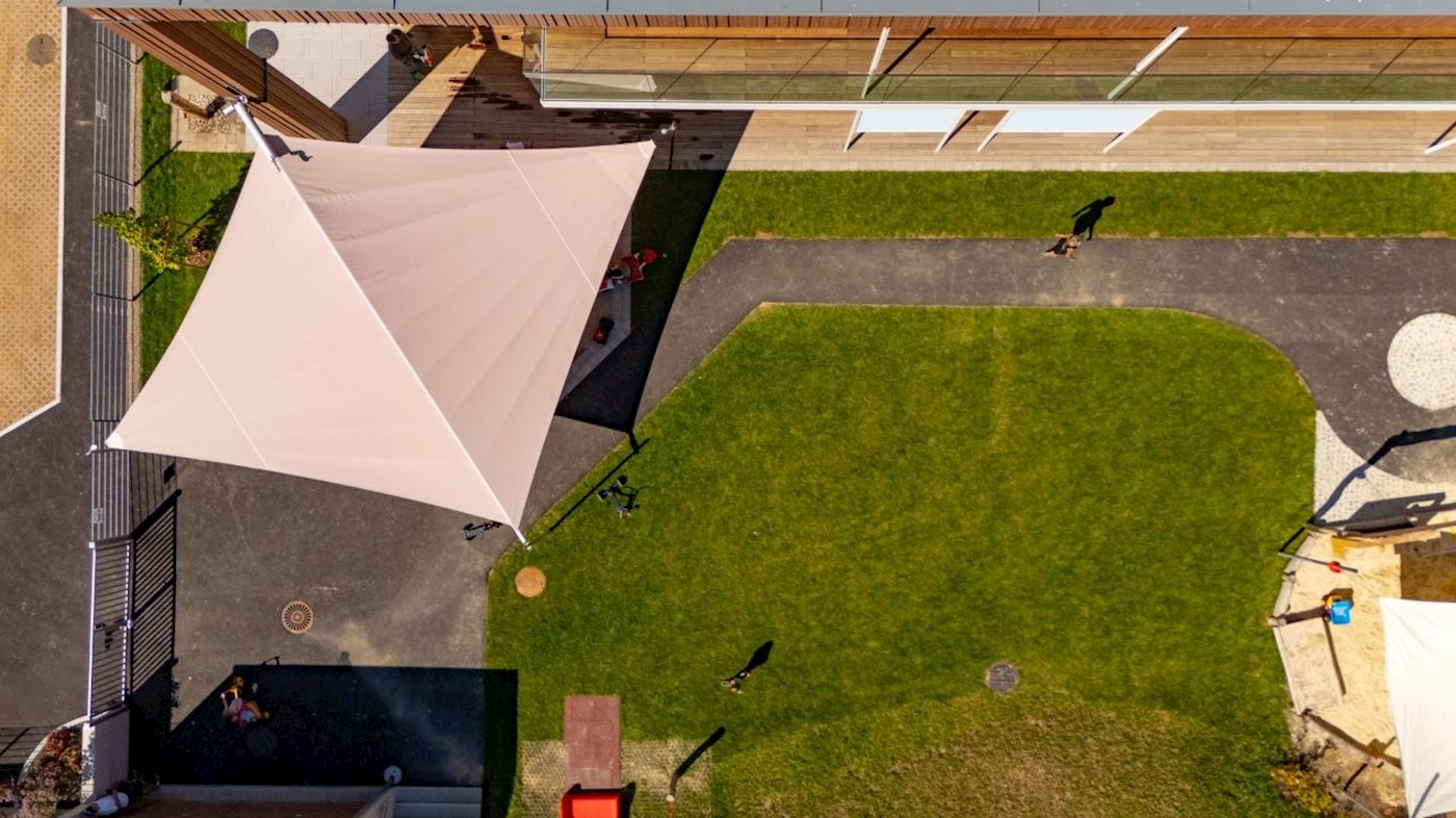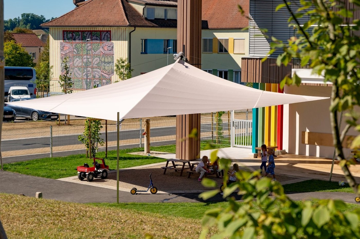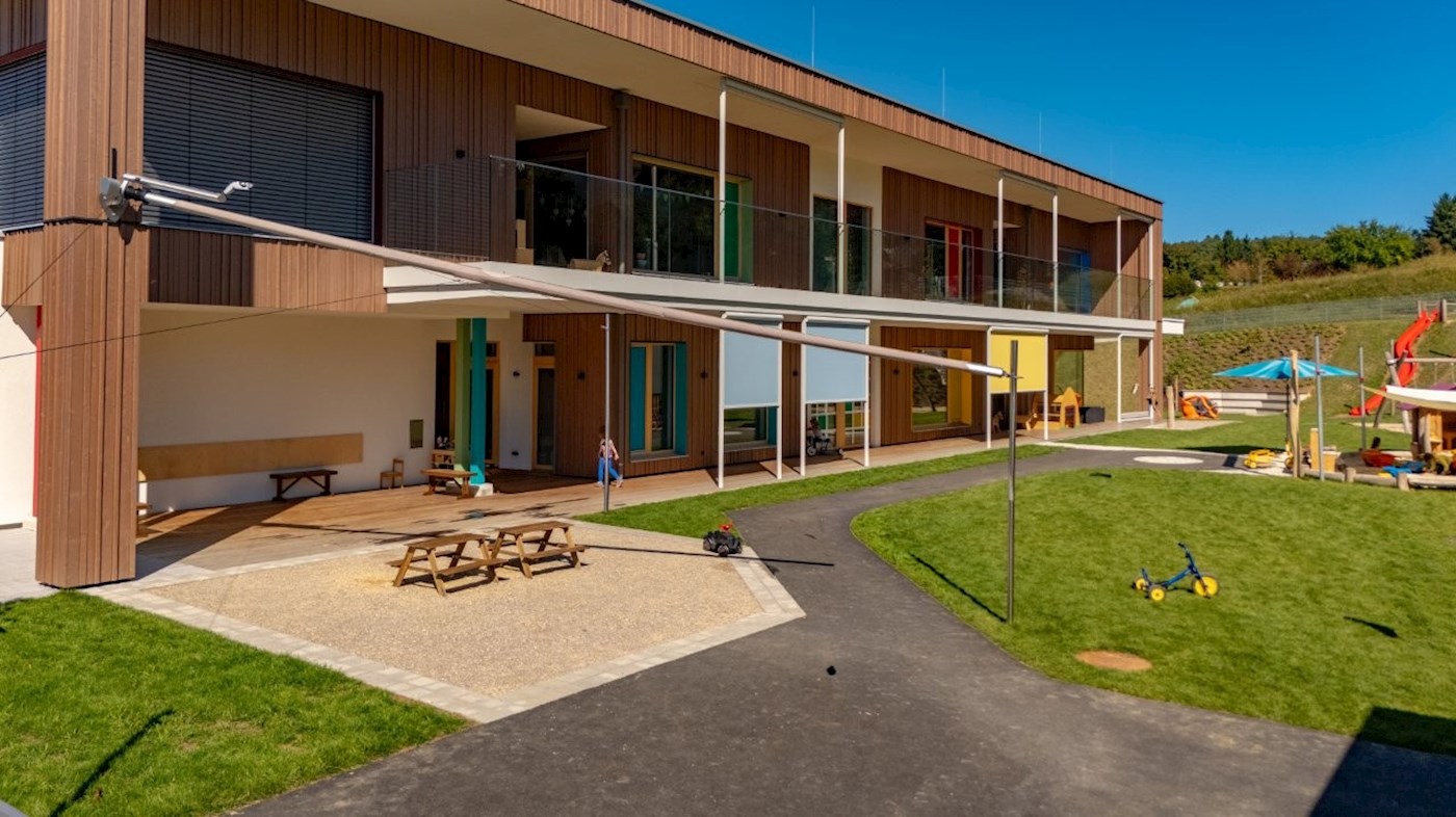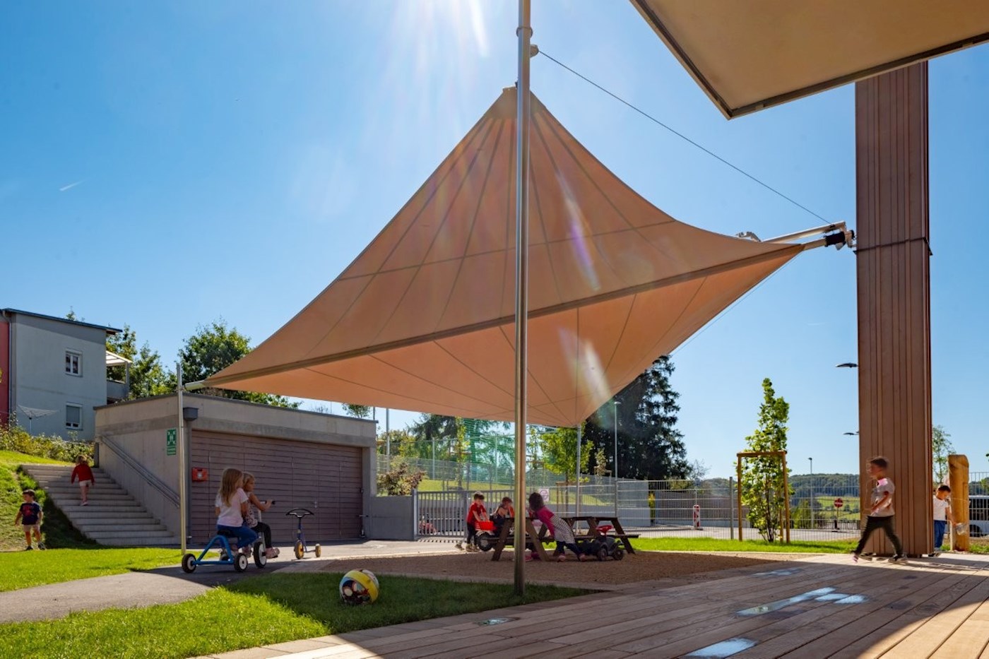 Im öffentlichen Ganztags-Kindergarten in der Oststeiermark wurde ein aufrollbares, elektrisches Sonnensegel installiert. Es sorgt für die maximale Beschattung des Sandspielplatzes und bietet gleichzeitig Sonnen- und Regenschutz. Die Stützen wurden außerhalb des Fußweges positioniert, um die Bewegungsfreiheit der Kinder nicht einzuschränken.