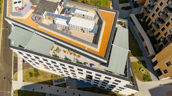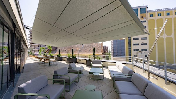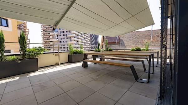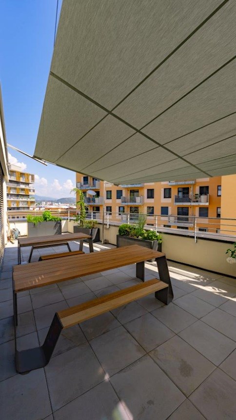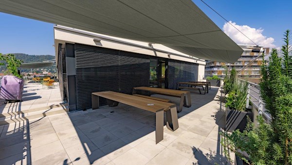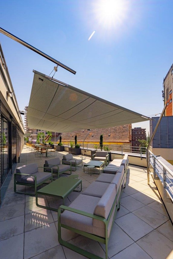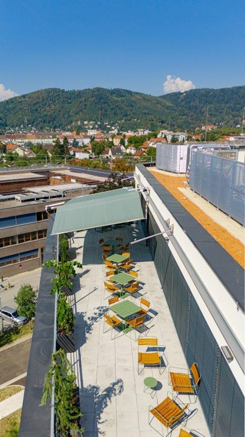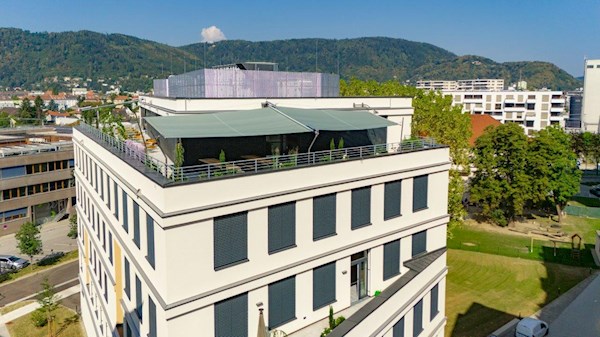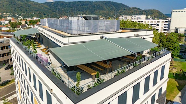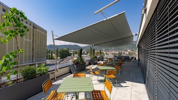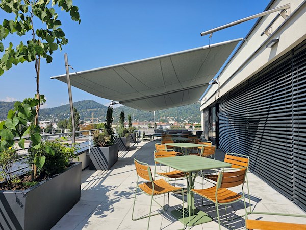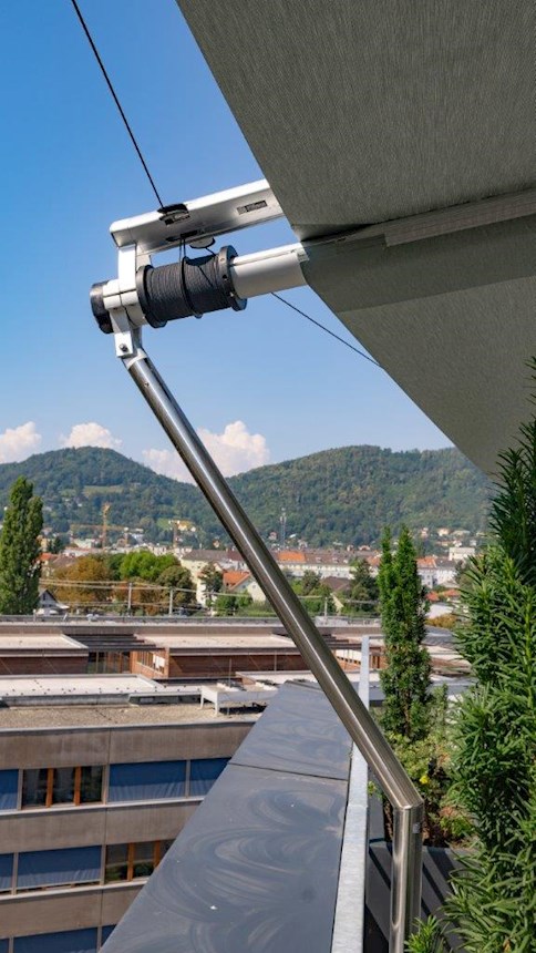 Dachterrassen-Beschattungen mittels aufrollbaren Sonnensegel für ein IT-Büro in Graz