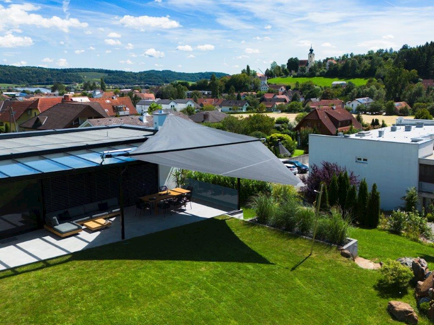 EFH in der Oststeiermark: modernes Sonnensegel trifft modernes Wohnen