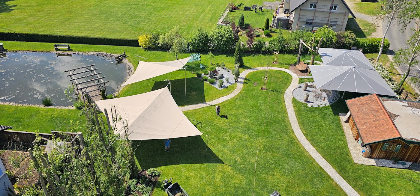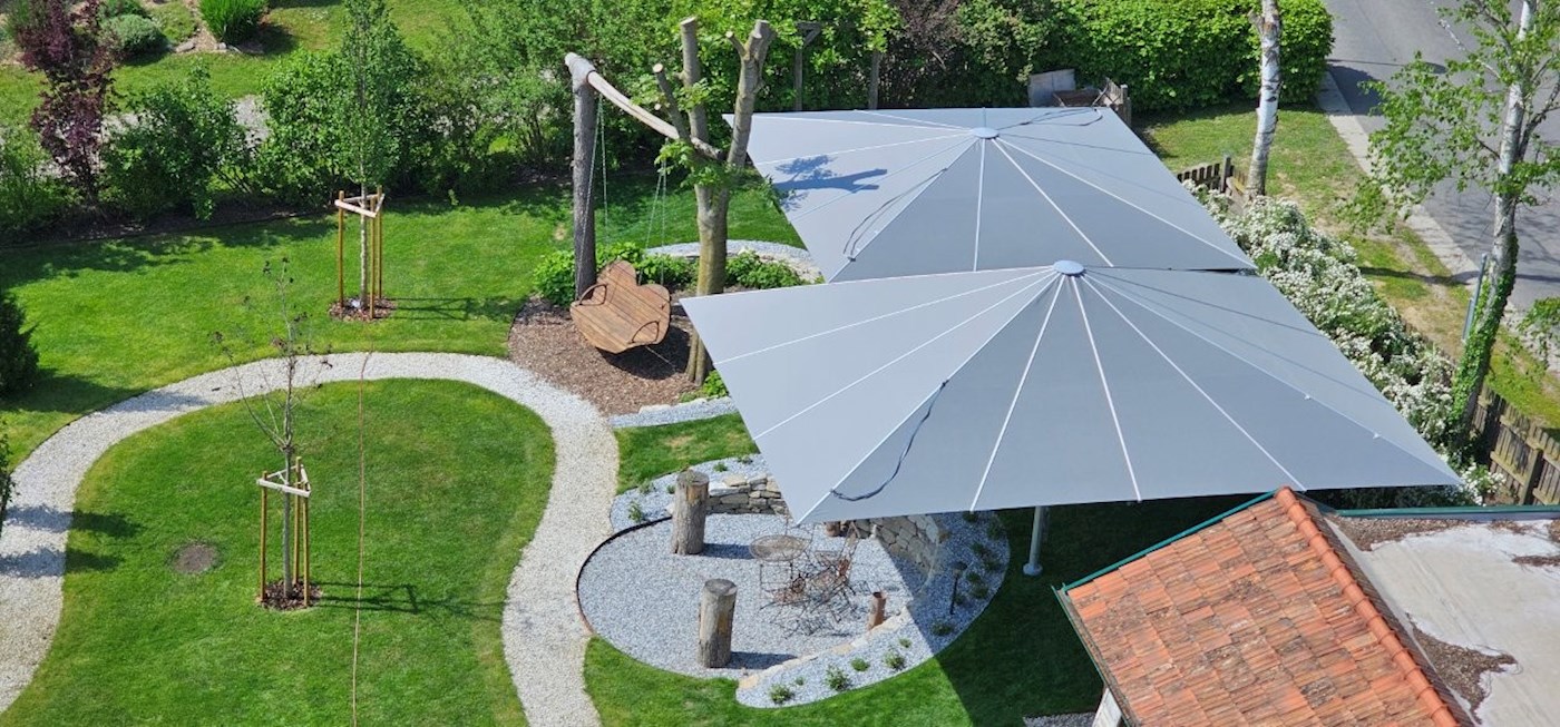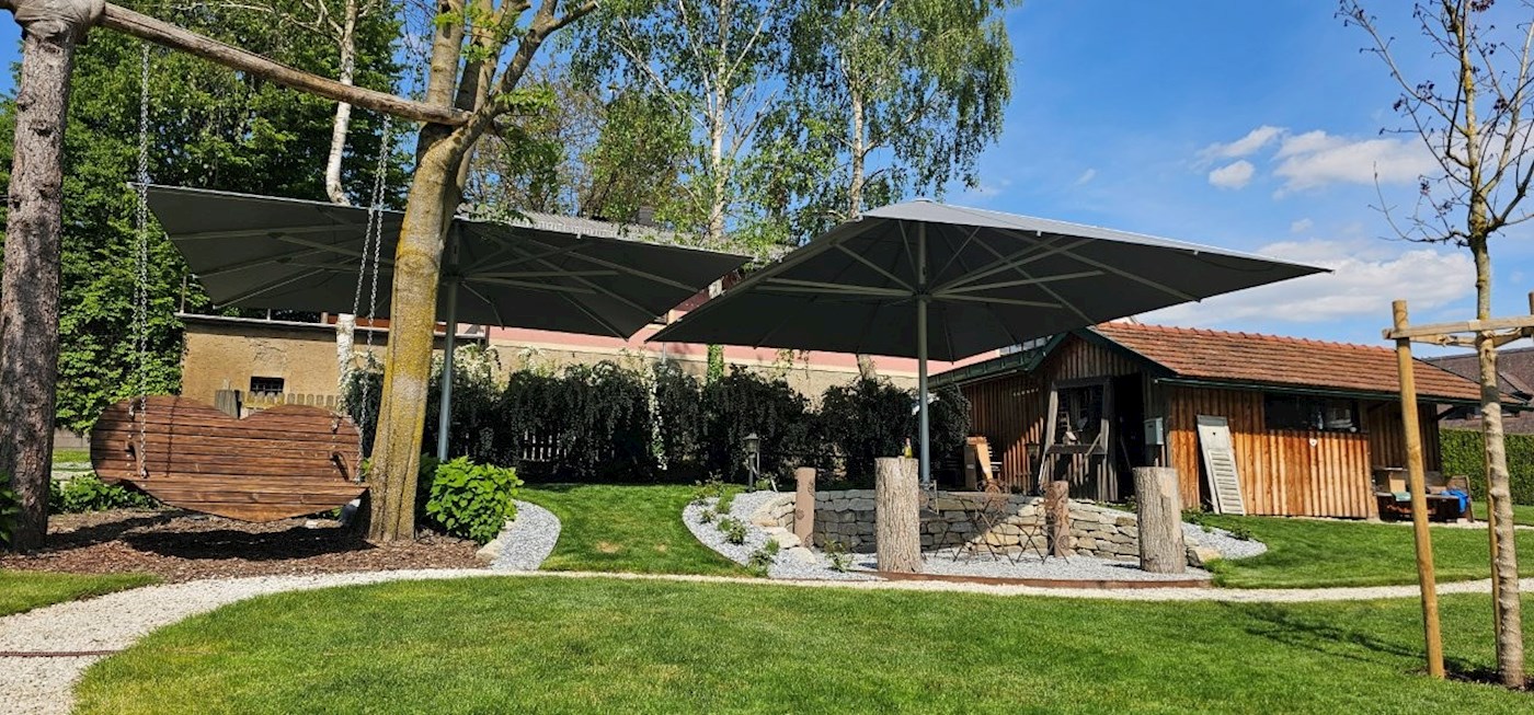 Die Parkanlage mit einer perfekten Kombination aus Naturzauber und stilvollem Ambiente. Jetzt wurde noch ein weiterer Bereich „Schattenspender + Regenschutz“ für die Hochzeitsgäste geplant und mittels zwei Grossflächen-SONNENSCHIRME (8x6m und 6x6m) erweitert. Eletrisch aufrollbare Sonnensegel (2x50m²) im Bereich der Teichanlage wurden bereits vor einigen Jahren installiert.