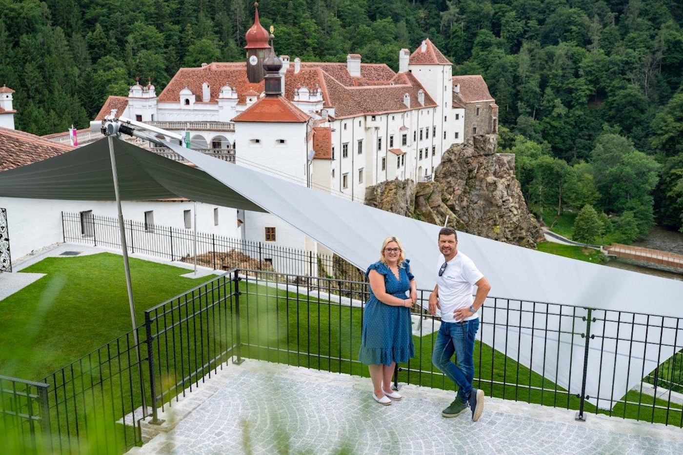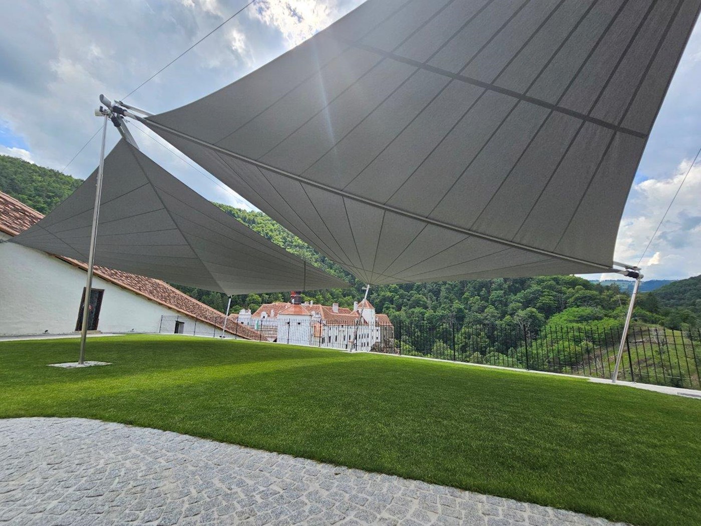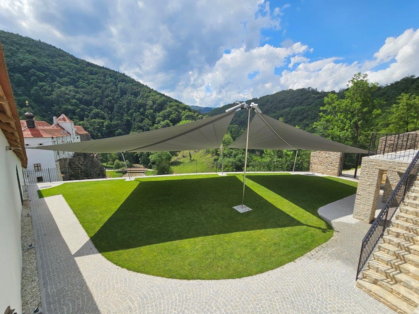 mit nur einer zentralen Mittelstütze und 3 Segelstützen mit spezieller Neigung am Geländer Bereich. So kann der wunderschöne Schlossgarten bei Sonne und Regen genossen werden. Bei jeder Veranstaltung. Tag und Nacht.